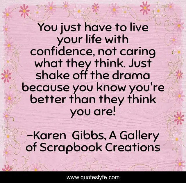 This page presents the quote "You just have to live your life with confidence, not caring what they think. Just shake off the drama because you know you're better than they think you are!". Author of this quote is Karen Gibbs, A Gallery of Scrapbook Creations. This quote is about attitude-toward-life, confidence, life, inspiration,.