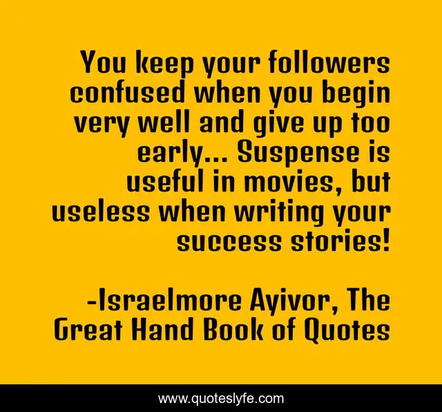 This page presents the quote "You keep your followers confused when you begin very well and give up too early... Suspense is useful in movies, but useless when writing your success stories!". Author of this quote is Israelmore Ayivor, The Great Hand Book of Quotes. This quote is about follow, begin, useful, success, confusion, useless, confuse, food-for-thought, keep,.