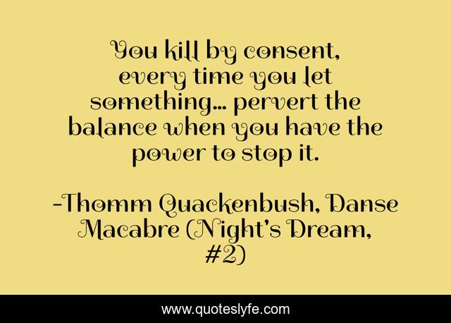 This page presents the quote "You kill by consent, every time you let something… pervert the balance when you have the power to stop it.". Author of this quote is Thomm Quackenbush, Danse Macabre (Night's Dream, #2). This quote is about consent, kill, balance, guilt, power,.