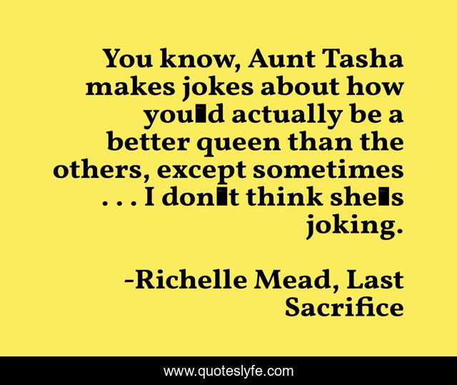 "Richelle Mead, Last Sacrifice Quotes." Quoteslyfe.com, 2026. Tue. 13 Jan. 2026. <https://www.quoteslyfe.com/quote/You-know-Aunt-Tasha-makes-jokes-about-84386>.