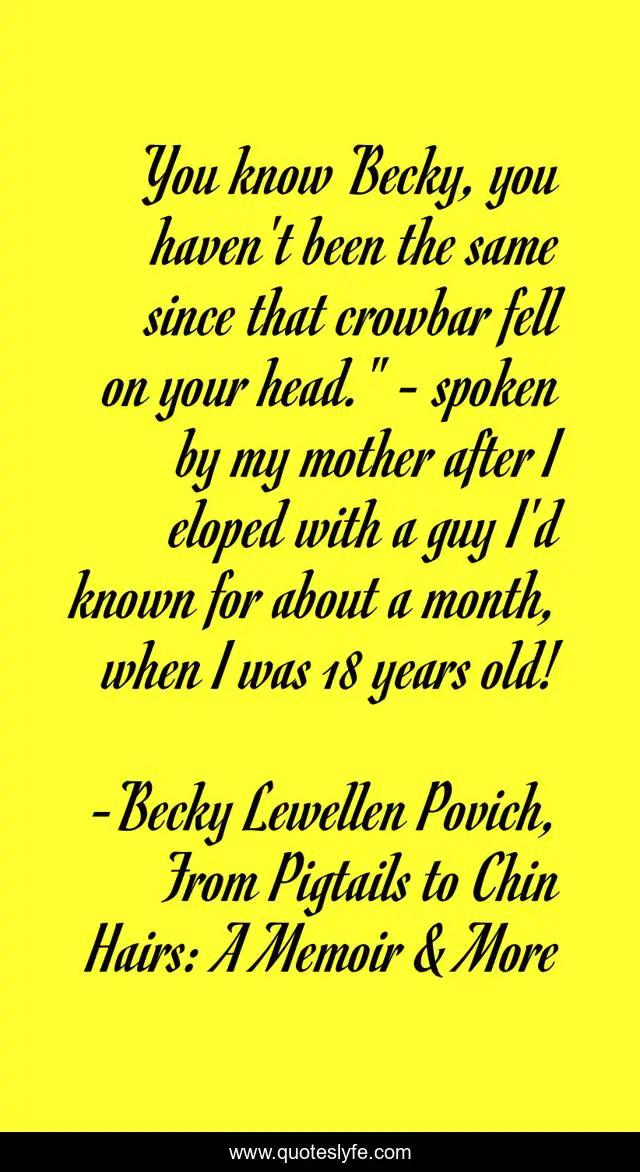 This page presents the quote "You know Becky, you haven't been the same since that crowbar fell on your head." - spoken by my mother after I eloped with a guy I'd known for about a month, when I was 18 years old!". Author of this quote is Becky Lewellen Povich, From Pigtails to Chin Hairs: A Memoir & More. This quote is about humor, memoir,.
