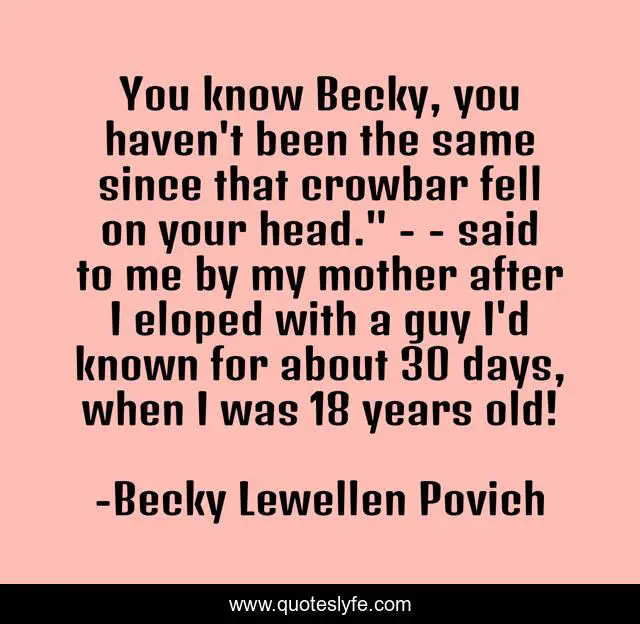 This page presents the quote "You know Becky, you haven't been the same since that crowbar fell on your head." - - said to me by my mother after I eloped with a guy I'd known for about 30 days, when I was 18 years old!". Author of this quote is Becky Lewellen Povich. This quote is about humor, memoir,.