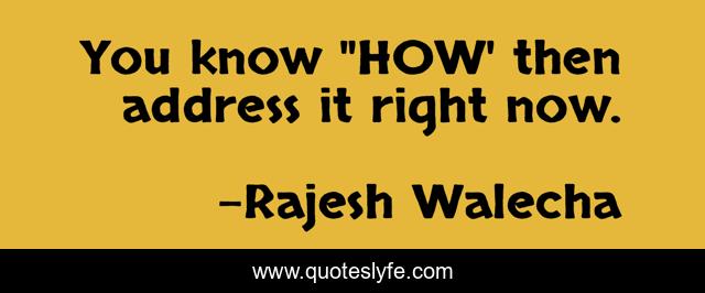 This page presents the quote "You know "HOW' then address it right now.". Author of this quote is Rajesh Walecha. This quote is about enthusiasm, inspirational,.