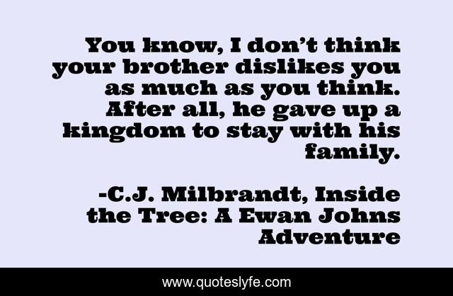This page presents the quote "You know, I don’t think your brother dislikes you as much as you think. After all, he gave up a kingdom to stay with his family.". Author of this quote is C.J. Milbrandt, Inside the Tree: A Ewan Johns Adventure. This quote is about kid-s-book, brothers, family, kid-s-literature, fantasy, sibling-relationships, sibling-rivalry,.