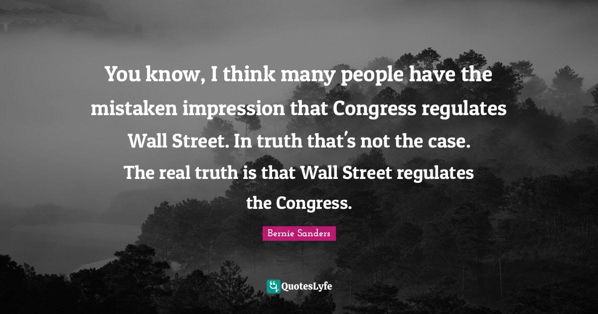 This page presents the quote "You know, I think many people have the mistaken impression that Congress regulates Wall Street. In truth that's not the case. The real truth is that Wall Street regulates the Congress.". Author of this quote is Bernie Sanders. This quote is about thinking, real truth, people, truth, congress, real, wall, mistaken, impression,.