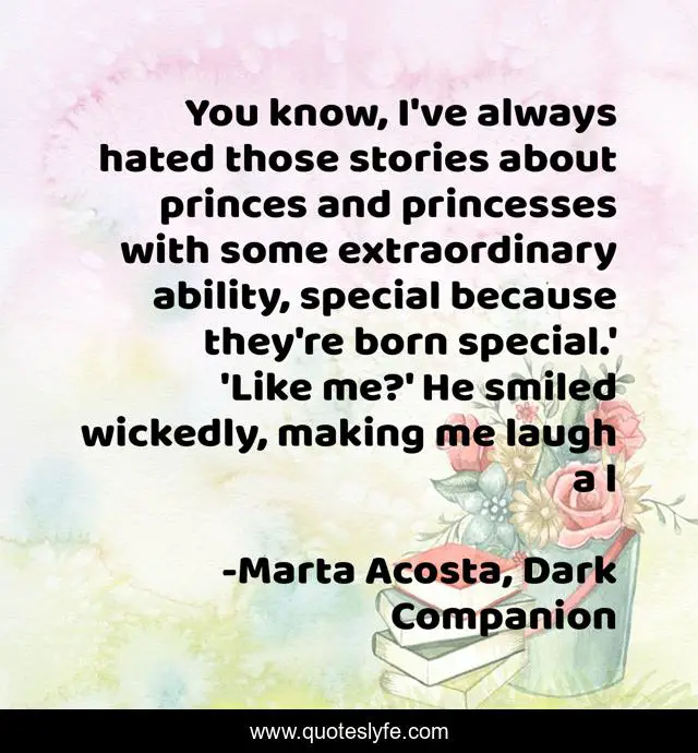 This page presents the quote "You know, I've always hated those stories about princes and princesses with some extraordinary ability, special because they're born special.' 'Like me?' He smiled wickedly, making me laugh a l". Author of this quote is Marta Acosta, Dark Companion. This quote is about miracles, meta, special-snowflakes,.