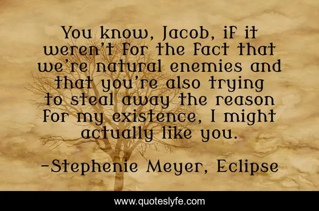 This page presents the quote "You know, Jacob, if it weren’t for the fact that we’re natural enemies and that you’re also trying to steal away the reason for my existence, I might actually like you.". Author of this quote is Stephenie Meyer, Eclipse. This quote is about jacob-black, edward-cullen, friendship,.