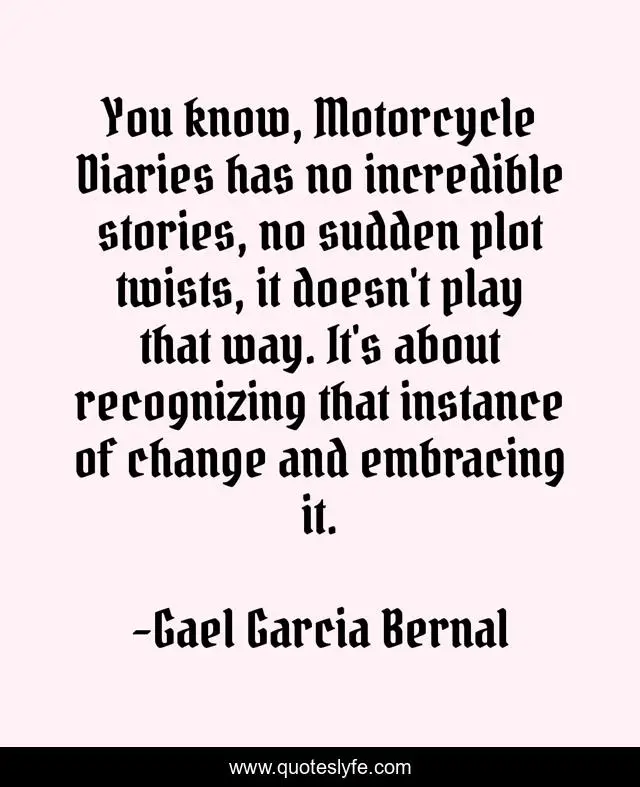 This page presents the quote "You know, Motorcycle Diaries has no incredible stories, no sudden plot twists, it doesn't play that way. It's about recognizing that instance of change and embracing it.". Author of this quote is Gael Garcia Bernal. This quote is about play, motorcycle,.