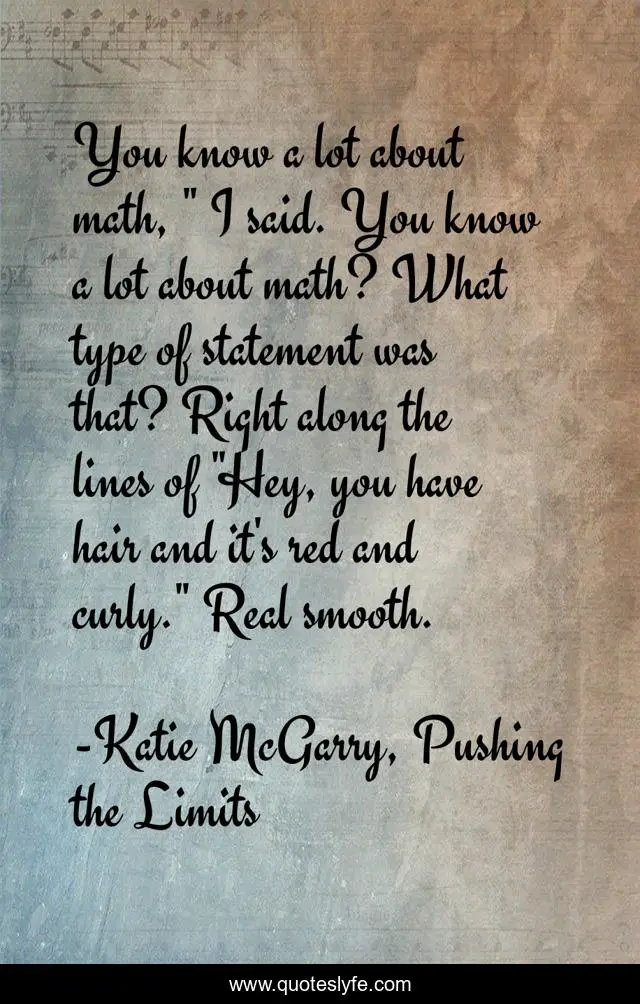 This page presents the quote "You know a lot about math, " I said. You know a lot about math? What type of statement was that? Right along the lines of "Hey, you have hair and it's red and curly." Real smooth.". Author of this quote is Katie McGarry, Pushing the Limits. This quote is about cute, echo-and-noah, pushing-the-limits, echo-emerson, noah-hutchins, katie-mcgarry, sweet,.