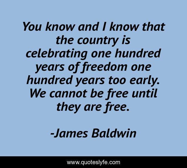 This page presents the quote "You know and I know that the country is celebrating one hundred years of freedom one hundred years too early. We cannot be free until they are free.". Author of this quote is James Baldwin. This quote is about oppression, race,.