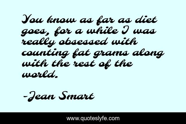 This page presents the quote "You know as far as diet goes, for a while I was really obsessed with counting fat grams along with the rest of the world.". Author of this quote is Jean Smart. This quote is about world, fat,.