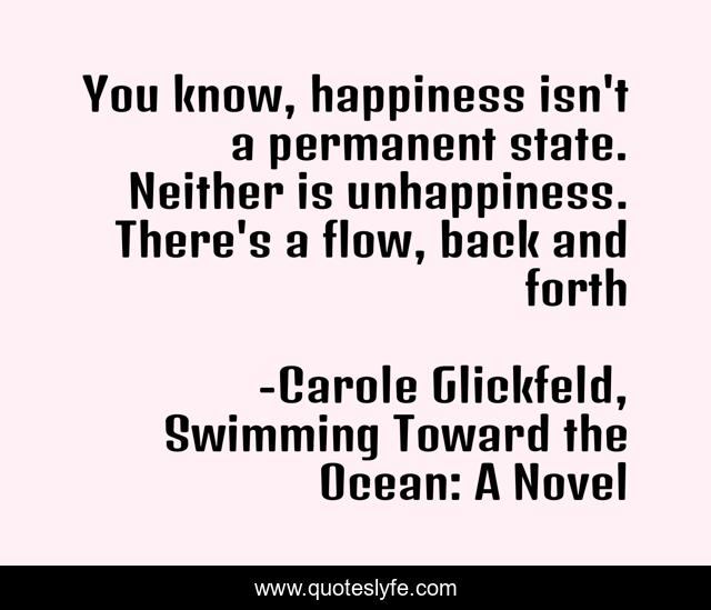 This page presents the quote "You know, happiness isn't a permanent state. Neither is unhappiness. There's a flow, back and forth". Author of this quote is Carole Glickfeld, Swimming Toward the Ocean: A Novel. This quote is about happiness, unhappiness,.