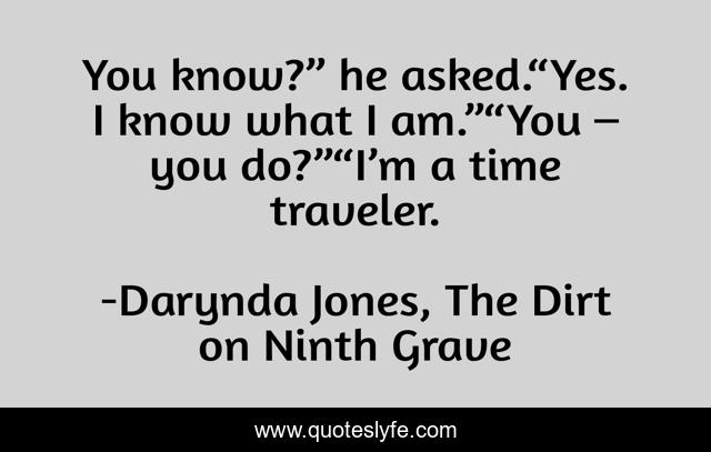 This page presents the quote "You know?” he asked.“Yes. I know what I am.”“You – you do?”“I’m a time traveler.". Author of this quote is Darynda Jones, The Dirt on Ninth Grave. This quote is about humorous, charley-davidson, reyes-farrow,.
