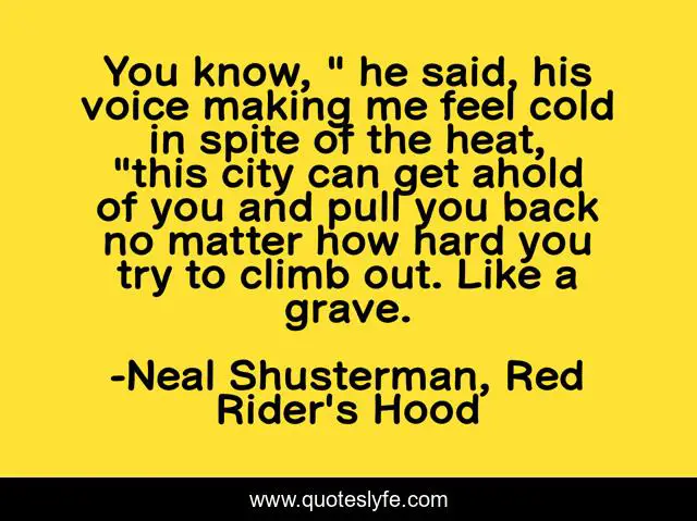 This page presents the quote "You know, " he said, his voice making me feel cold in spite of the heat, "this city can get ahold of you and pull you back no matter how hard you try to climb out. Like a grave.". Author of this quote is Neal Shusterman, Red Rider's Hood. This quote is about city, grave,.