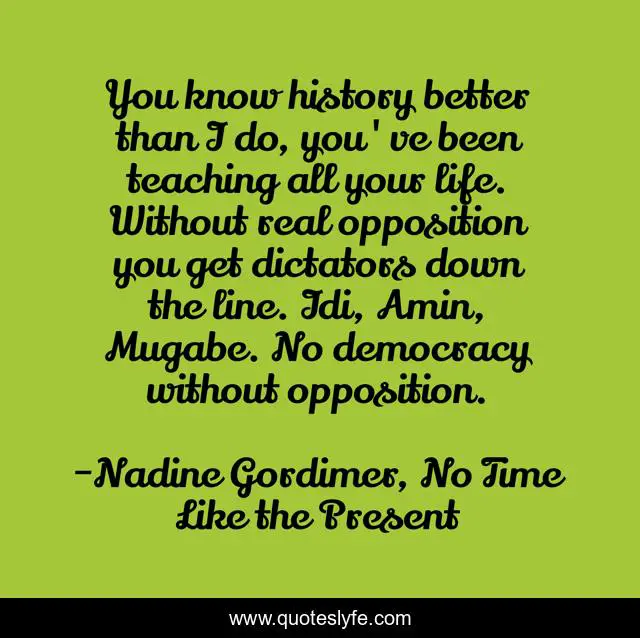This page presents the quote "You know history better than I do, you've been teaching all your life. Without real opposition you get dictators down the line. Idi, Amin, Mugabe. No democracy without opposition.". Author of this quote is Nadine Gordimer, No Time Like the Present. This quote is about democracy, dictatorship,.