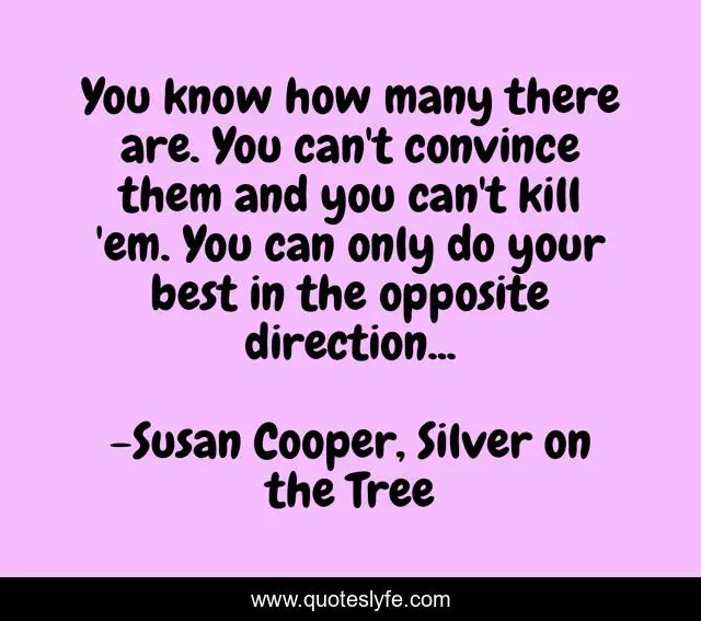 This page presents the quote "You know how many there are. You can't convince them and you can't kill 'em. You can only do your best in the opposite direction...". Author of this quote is Susan Cooper, Silver on the Tree. This quote is about opinions, bigotry, racism,.