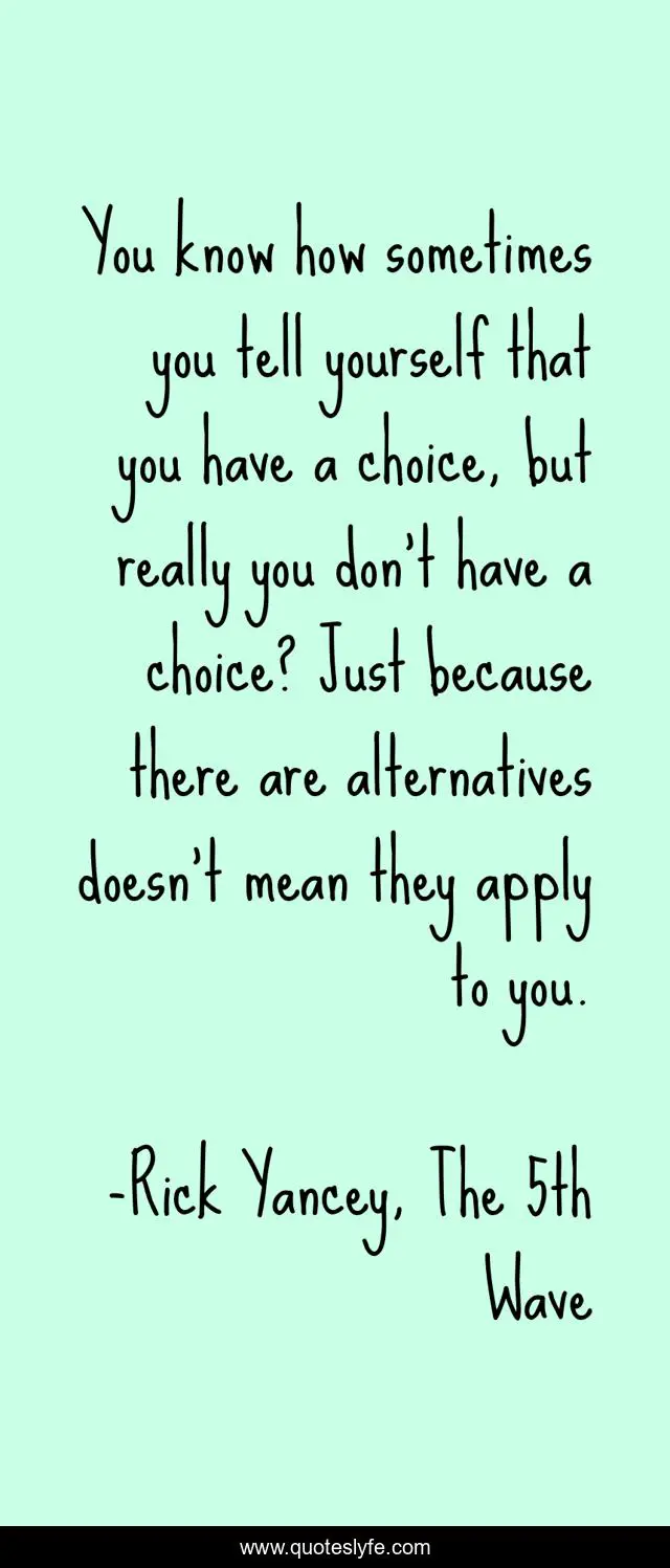 This page presents the quote "You know how sometimes you tell yourself that you have a choice, but really you don't have a choice? Just because there are alternatives doesn't mean they apply to you.". Author of this quote is Rick Yancey, The 5th Wave. This quote is about apocalypse, horror, paranormal, science-fiction, fiction, alien, post-apocalyptic, choices, young-adult,.