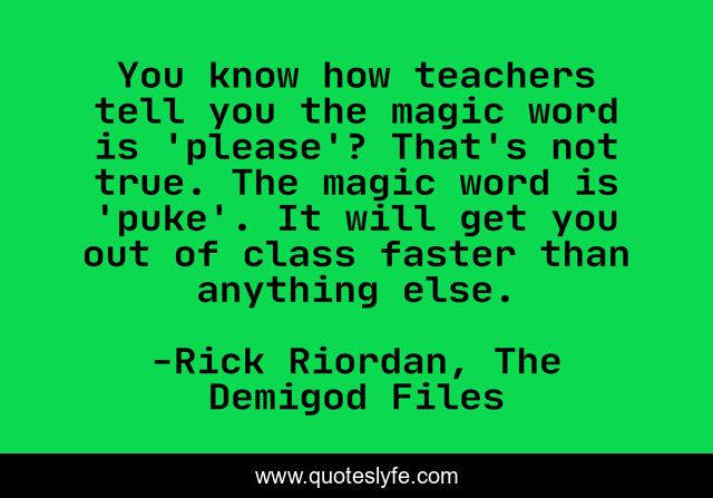 This page presents the quote "You know how teachers tell you the magic word is 'please'? That's not true. The magic word is 'puke'. It will get you out of class faster than anything else.". Author of this quote is Rick Riordan, The Demigod Files. This quote is about funny, comedy, percy-jackson, puke,.
