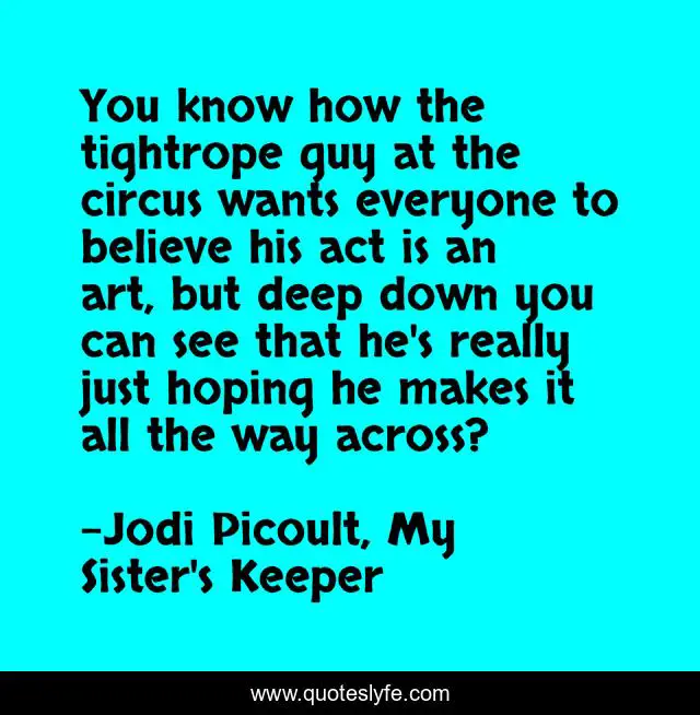 This page presents the quote "You know how the tightrope guy at the circus wants everyone to believe his act is an art, but deep down you can see that he's really just hoping he makes it all the way across?". Author of this quote is Jodi Picoult, My Sister's Keeper. This quote is about life, philosophy, sister,.