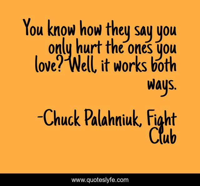 This page presents the quote "You know how they say you only hurt the ones you love? Well, it works both ways.". Author of this quote is Chuck Palahniuk, Fight Club. This quote is about love, affection,.