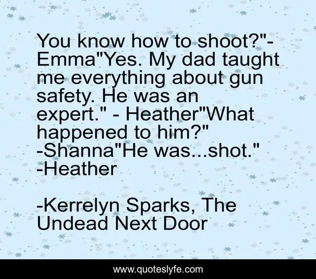 This page presents the quote "You know how to shoot?"- Emma"Yes. My dad taught me everything about gun safety. He was an expert." - Heather"What happened to him?" -Shanna"He was...shot." -Heather". Author of this quote is Kerrelyn Sparks, The Undead Next Door. .