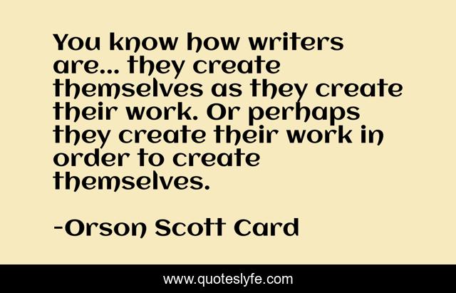 This page presents the quote "You know how writers are... they create themselves as they create their work. Or perhaps they create their work in order to create themselves.". Author of this quote is Orson Scott Card. This quote is about writers, art, writing,.