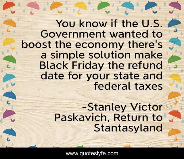 This page presents the quote "You know if the U.S. Government wanted to boost the economy there's a simple solution make Black Friday the refund date for your state and federal taxes". Author of this quote is Stanley Victor Paskavich, Return to Stantasyland. This quote is about tax-refunds, taxes, black-friday, holidays, christmas, economy,.