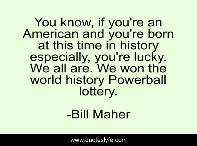 This page presents the quote "You know, if you're an American and you're born at this time in history especially, you're lucky. We all are. We won the world history Powerball lottery.". Author of this quote is Bill Maher. This quote is about americans, humor, luck,.