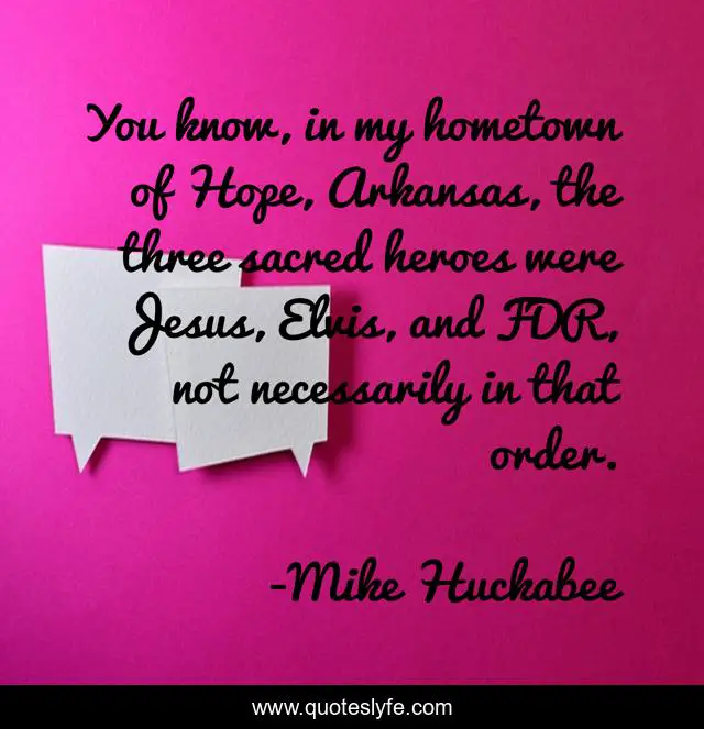 This page presents the quote "You know, in my hometown of Hope, Arkansas, the three sacred heroes were Jesus, Elvis, and FDR, not necessarily in that order.". Author of this quote is Mike Huckabee. .