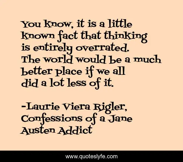 This page presents the quote "You know, it is a little known fact that thinking is entirely overrated. The world would be a much better place if we all did a lot less of it.". Author of this quote is Laurie Viera Rigler, Confessions of a Jane Austen Addict. This quote is about thinking, stress-management, overthinking, stress,.
