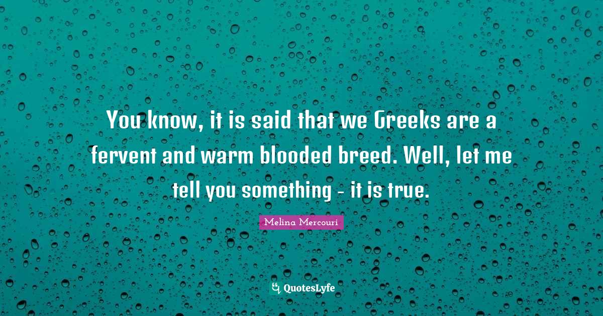 This page presents the quote "You know, it is said that we Greeks are a fervent and warm blooded breed. Well, let me tell you something - it is true.". Author of this quote is Melina Mercouri. This quote is about fervent, let me, glowing, warm, said, greek,.
