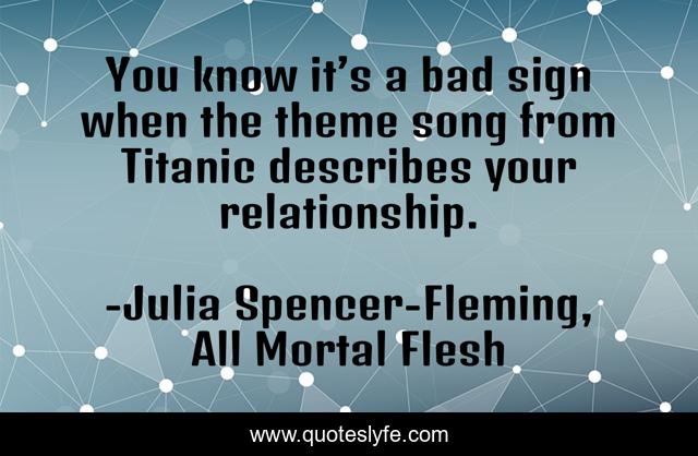 This page presents the quote "You know it’s a bad sign when the theme song from Titanic describes your relationship.". Author of this quote is Julia Spencer-Fleming, All Mortal Flesh. This quote is about relationships, love, affection,.