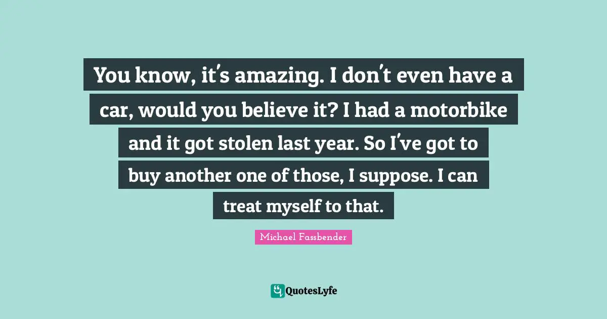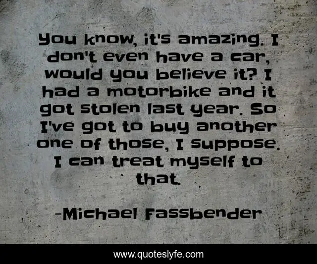 This page presents the quote "You know, it's amazing. I don't even have a car, would you believe it? I had a motorbike and it got stolen last year. So I've got to buy another one of those, I suppose. I can treat myself to that.". Author of this quote is Michael Fassbender. This quote is about car, myself, believe,.