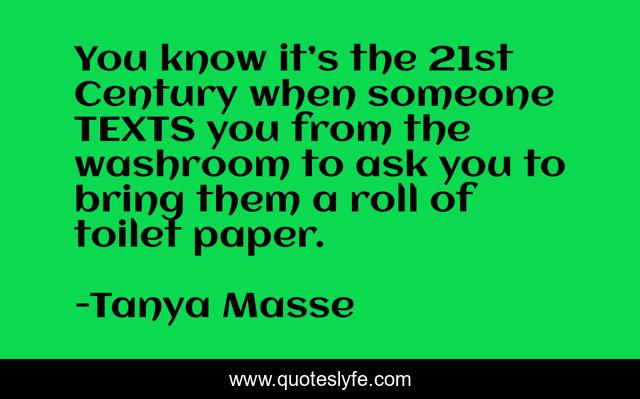 This page presents the quote "You know it’s the 21st Century when someone TEXTS you from the washroom to ask you to bring them a roll of toilet paper.". Author of this quote is Tanya Masse. This quote is about life-today, 21st-century, humor, quotes-about-life,.