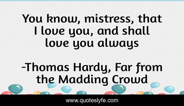 This page presents the quote "You know, mistress, that I love you, and shall love you always". Author of this quote is Thomas Hardy, Far from the Madding Crowd. This quote is about thomas-hardy, love-you-forever, romantic, steadfast, bathsheba-everdene, gabriel-oak, declarations-of-love, loyal, far-from-the-madding-crowd,.