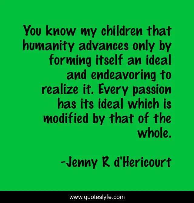 This page presents the quote "You know my children that humanity advances only by forming itself an ideal and endeavoring to realize it. Every passion has its ideal which is modified by that of the whole.". Author of this quote is Jenny R d'Hericourt. .
