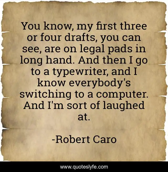 This page presents the quote "You know, my first three or four drafts, you can see, are on legal pads in long hand. And then I go to a typewriter, and I know everybody's switching to a computer. And I'm sort of laughed at.". Author of this quote is Robert Caro. .