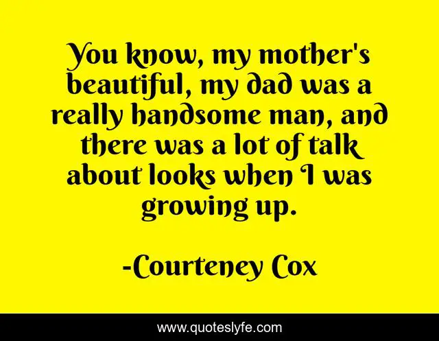 This page presents the quote "You know, my mother's beautiful, my dad was a really handsome man, and there was a lot of talk about looks when I was growing up.". Author of this quote is Courteney Cox. This quote is about beautiful, mother, man,.
