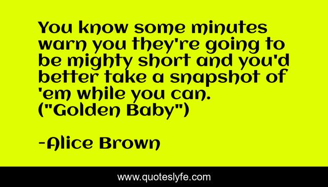 This page presents the quote "You know some minutes warn you they're going to be mighty short and you'd better take a snapshot of 'em while you can. ("Golden Baby")". Author of this quote is Alice Brown. .