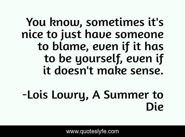 This page presents the quote "You know, sometimes it's nice to just have someone to blame, even if it has to be yourself, even if it doesn't make sense.". Author of this quote is Lois Lowry, A Summer to Die. This quote is about regret, difficulty, memories, acceptance, feelings, challenges, forgetting, mistakes, experiences,.