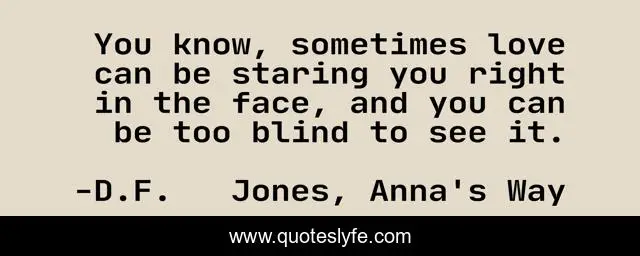 This page presents the quote "You know, sometimes love can be staring you right in the face, and you can be too blind to see it.". Author of this quote is D.F. Jones, Anna's Way. This quote is about fantasy-romance, christian-fiction, paranormal-romance, romance-novels,.