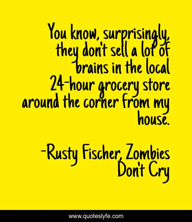 This page presents the quote "You know, surprisingly, they don't sell a lot of brains in the local 24-hour grocery store around the corner from my house.". Author of this quote is Rusty Fischer, Zombies Don't Cry. This quote is about brains, zombies,.