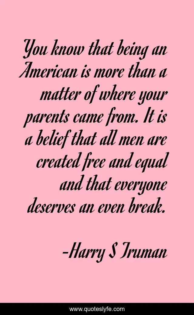 This page presents the quote "You know that being an American is more than a matter of where your parents came from. It is a belief that all men are created free and equal and that everyone deserves an even break.". Author of this quote is Harry S Truman. This quote is about american, parents, free,.