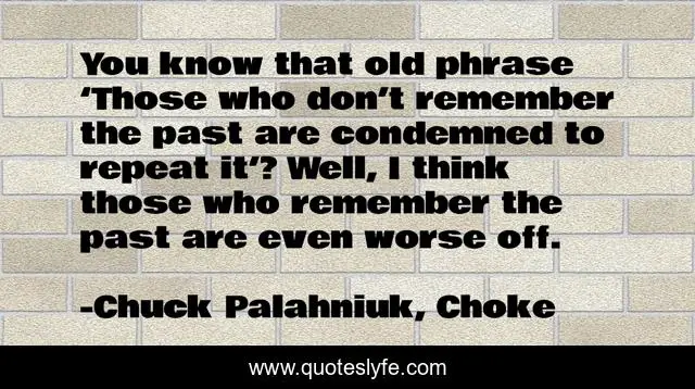 This page presents the quote "You know that old phrase ‘Those who don’t remember the past are condemned to repeat it’? Well, I think those who remember the past are even worse off.". Author of this quote is Chuck Palahniuk, Choke. .