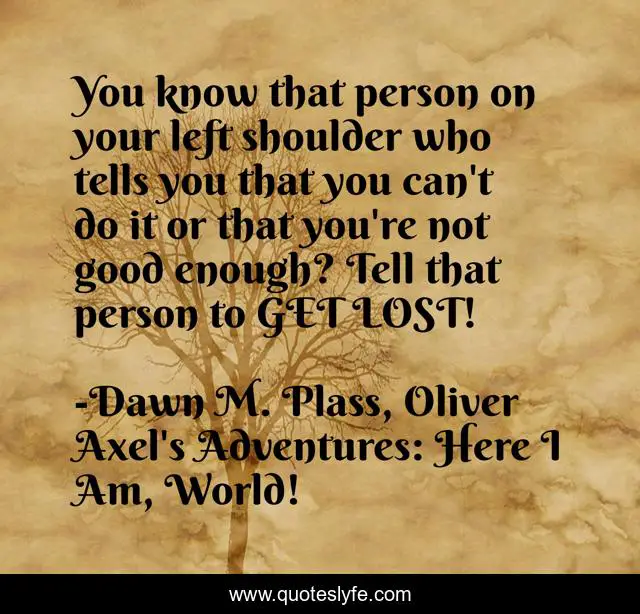 This page presents the quote "You know that person on your left shoulder who tells you that you can't do it or that you're not good enough? Tell that person to GET LOST!". Author of this quote is Dawn M. Plass, Oliver Axel's Adventures: Here I Am, World!. This quote is about enthusiasm, humor, children, inspirational,.