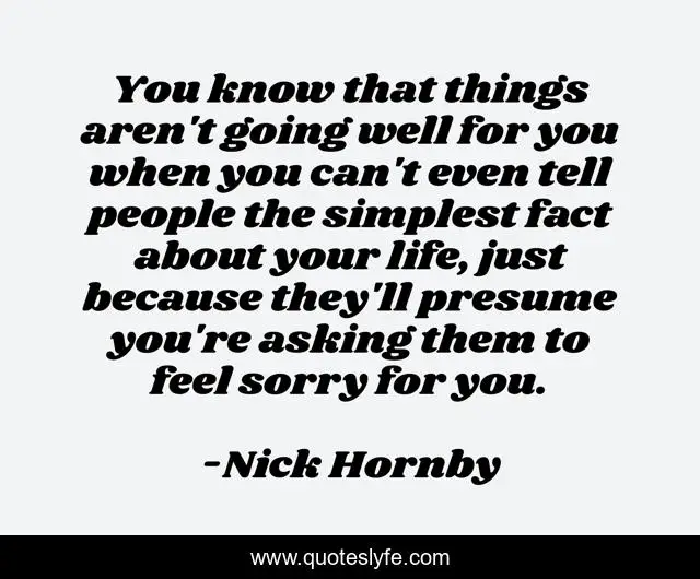 This page presents the quote "You know that things aren't going well for you when you can't even tell people the simplest fact about your life, just because they'll presume you're asking them to feel sorry for you.". Author of this quote is Nick Hornby. .