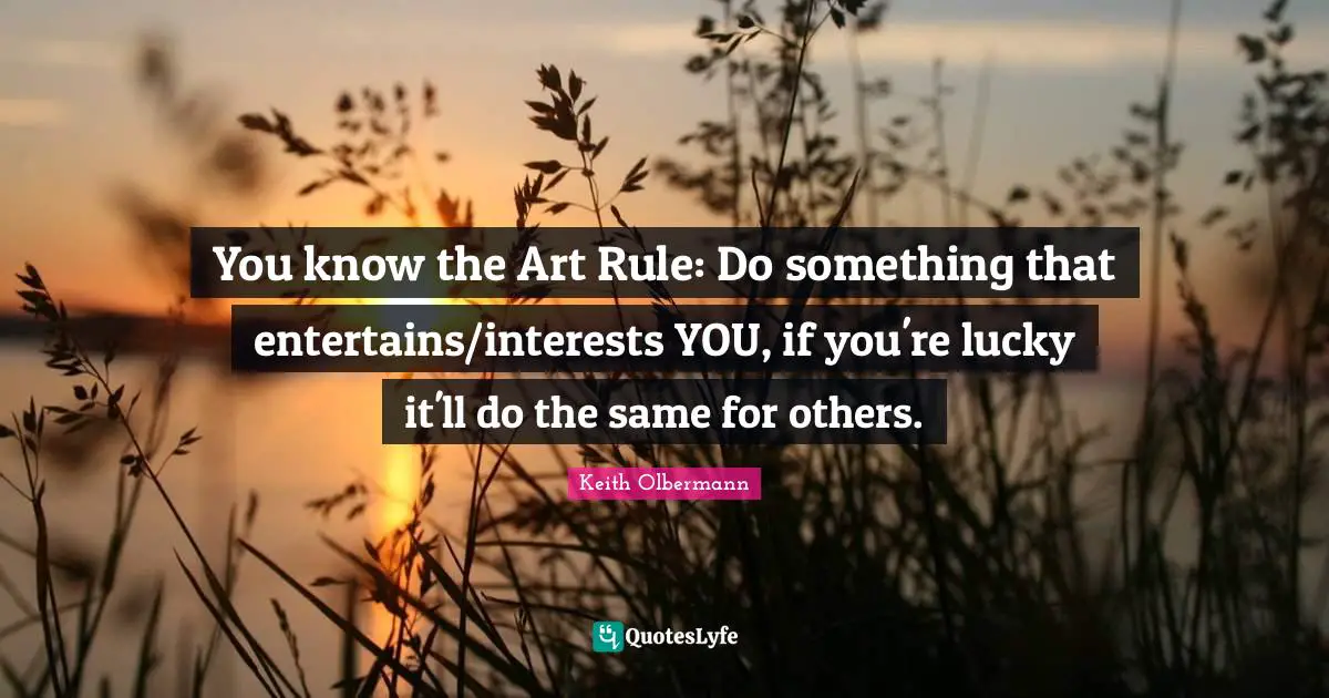 This page presents the quote "You know the Art Rule: Do something that entertains/interests YOU, if you're lucky it'll do the same for others.". Author of this quote is Keith Olbermann. This quote is about interest, art, lucky,.