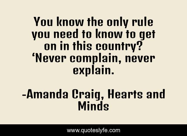 This page presents the quote "You know the only rule you need to know to get on in this country? ‘Never complain, never explain.". Author of this quote is Amanda Craig, Hearts and Minds. This quote is about reticent, stiff-upper-lip, explain, british, culture, english, complain,.