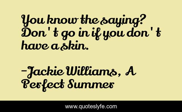 This page presents the quote "You know the saying? Don't go in if you don't have a skin.". Author of this quote is Jackie Williams, A Perfect Summer. This quote is about family-relationships, music-industry, second-chances, romance-novels,.