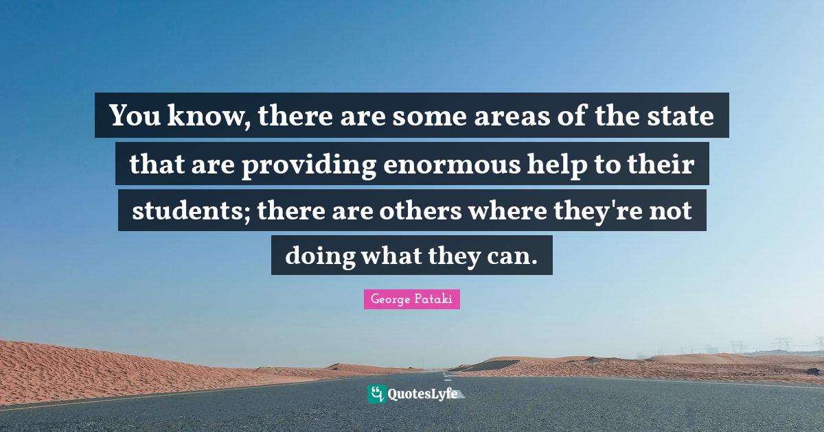 This page presents the quote "You know, there are some areas of the state that are providing enormous help to their students; there are others where they're not doing what they can.". Author of this quote is George Pataki. This quote is about areas, states, enormous, providing, helping, students,.